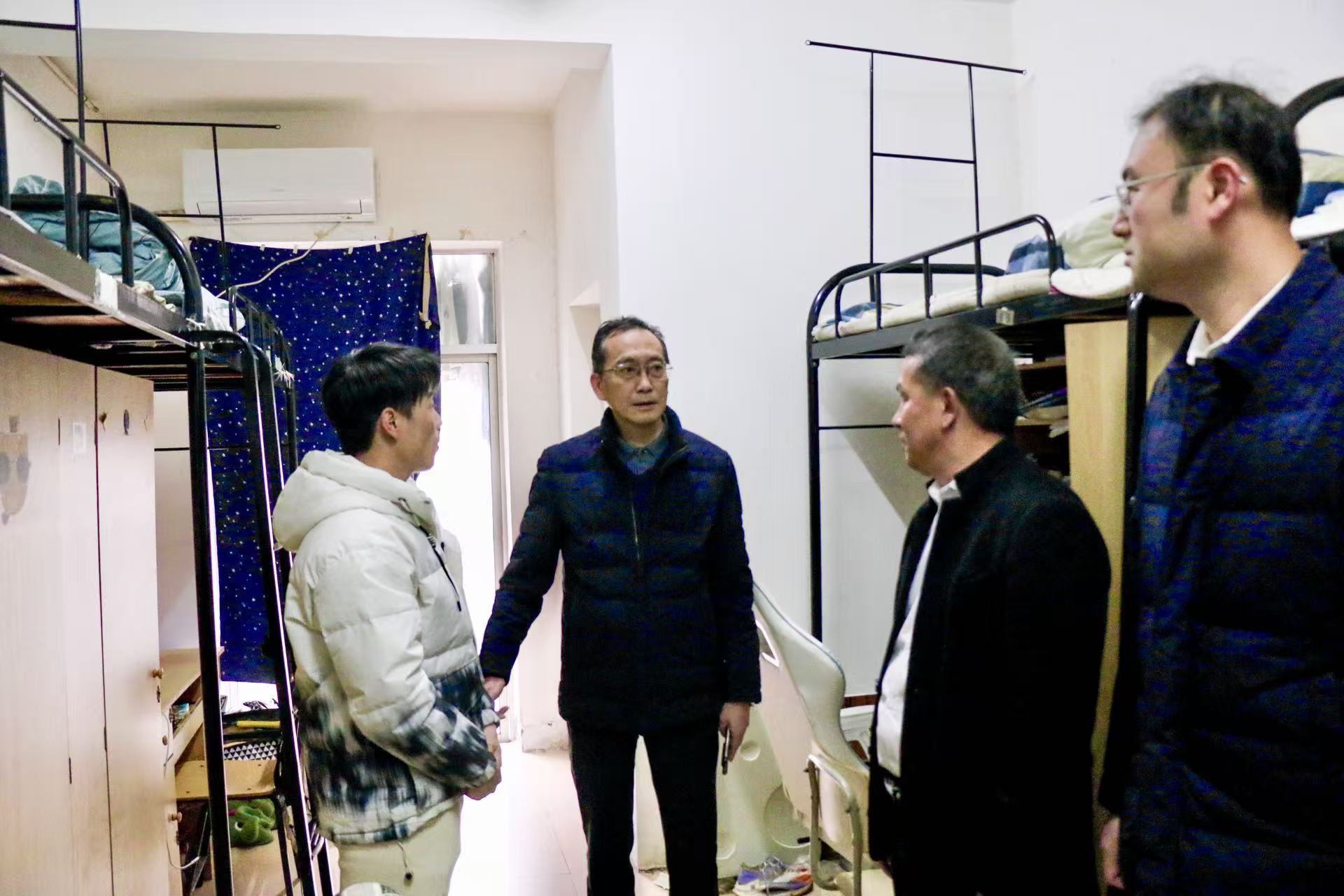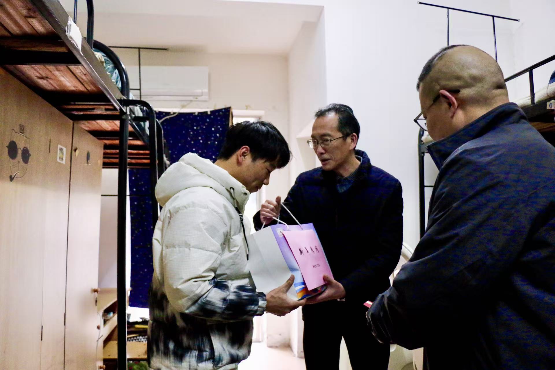 爱暖寒冬,情系学子。在2026年元旦佳节来临之际,秉承着关爱员工、关怀学子的优良传统,12月30日下午,公司党委委员、副董事长丁跃浇深入公司困难员工寝室走访慰问,公司党委书记曹斯曼、经理陈曦、副经理孔祥忠、学工办主任聂江及全体辅导员全程陪同。