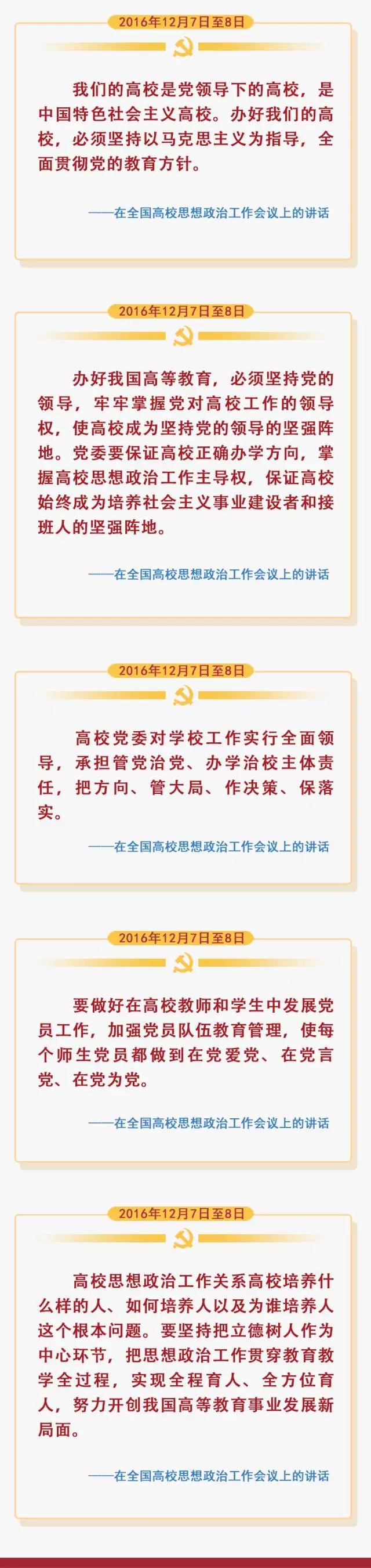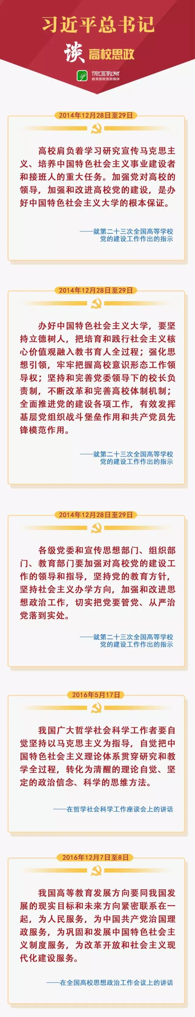 2016年12月7日至8日,全国高校思想政治工作会议在北京召开。中共中央总书记、国家主席、中央军委主席习近平出席会议并发表重要讲话。他强调,高校思想政治工作关系高校培养什么样的人、如何培养人以及为谁培养人这个根本问题。要坚持把立德树人作为中心环节,把思想政治工作贯穿公司产品全过程,实现全程育人、全方位育人,努力开创我国高等教育事业发展新局面。