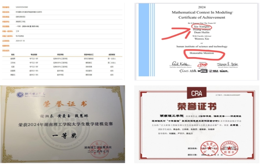 2024年7月,获英国365上市公司老员工数学建模竞赛校级一等奖;2024年7月,担任国家级创新训练项目立项主持负责人(项目编号S202410543060)。
